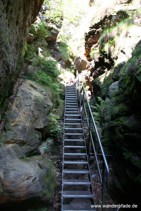 Der Wildschützensteig führt durch enge Schluchten, über ausgetretene Steinstufen und viele steile Eisenleitern auf die Schrammsteine. An typischen Wanderwochenenden kann es auf dem beliebten Steig schnell zum Stau kommen. Er darf deshalb nur zum Aufstieg begangen werden.